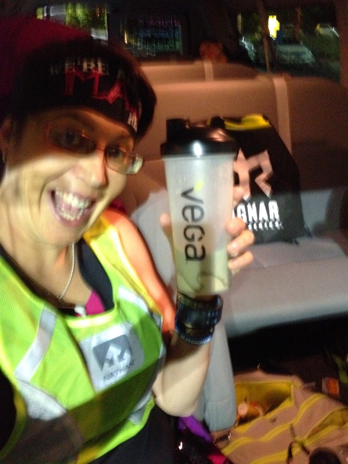 I was super excited when I saw the "ONE MORE MILE" sign but was thinking wow...I must be motoring. Alas...about 12 more minutes later I see another "ONE MORE MILE" sign. I believe I swore a blue streak out loud! A runner behind me and a runner ahead heard. We all laughed. I mean...you cant tease us - we are sleep deprived and somewhat crazy at this point! I finished and was sooo cold - the wind had picked up and it was past 10pm. I was STARVING yet had no energy to eat. Thank god the gals had some eggs and salty chips handy. And some Almond Milk! I ate that. rested. Ate again. Napped. Cheered. Ate again. Napped. Cheered. You get the cyclical picture.